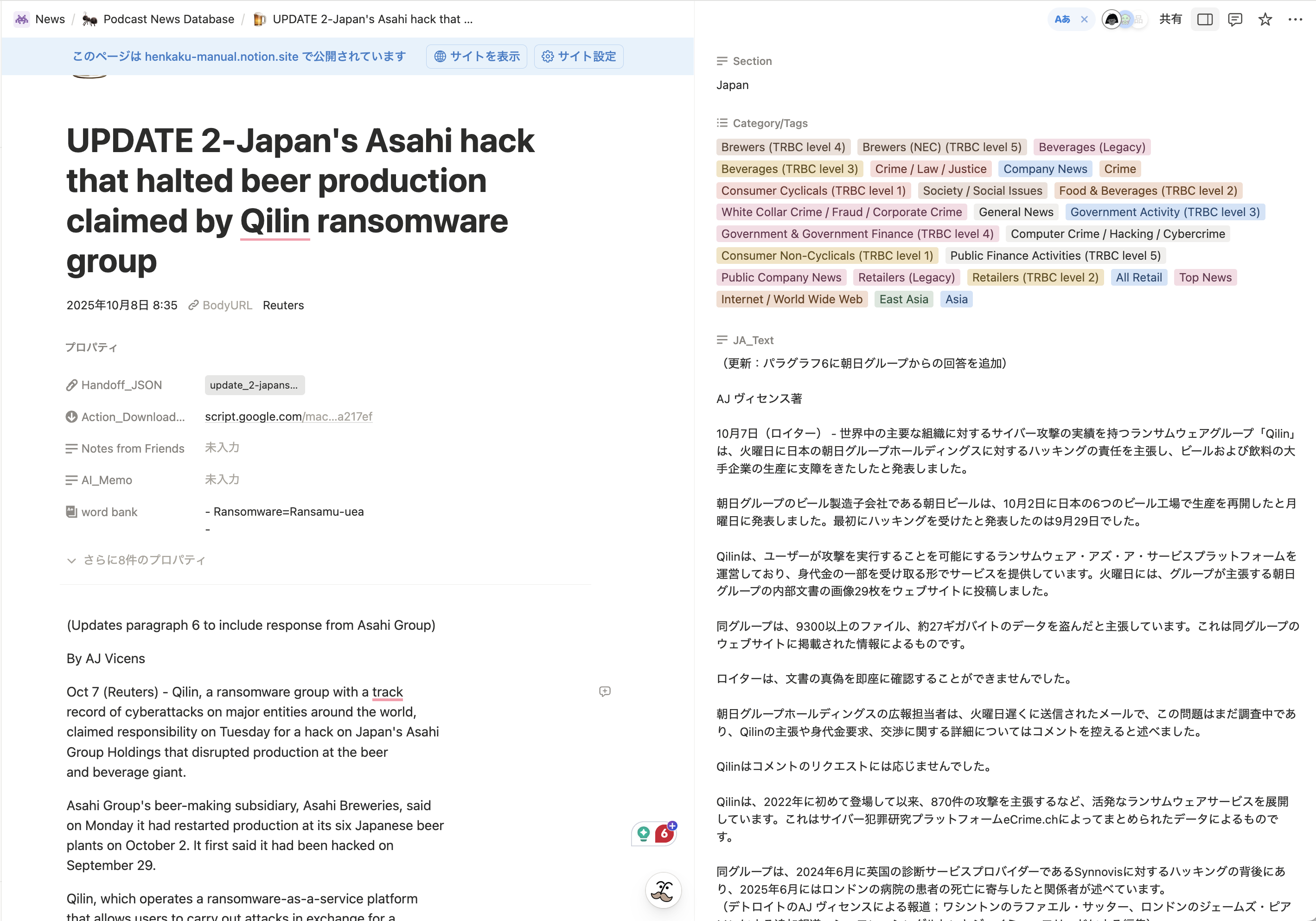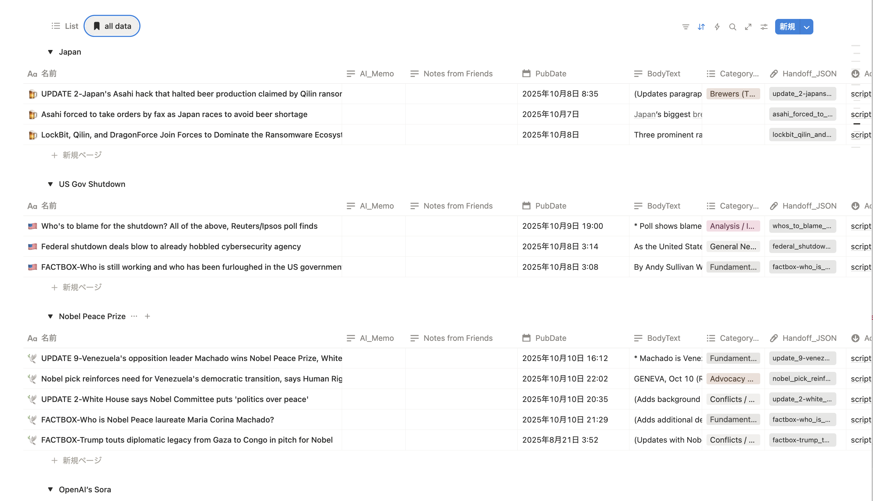 News XML feed (export) ↓ Google Drive → GAS Import_XML ↓ Notion database ↓ Download links (JSON / Markdown) ↓ AI summarization / email formatting (next step) ↓ Manual review / memo writing (by Joi)